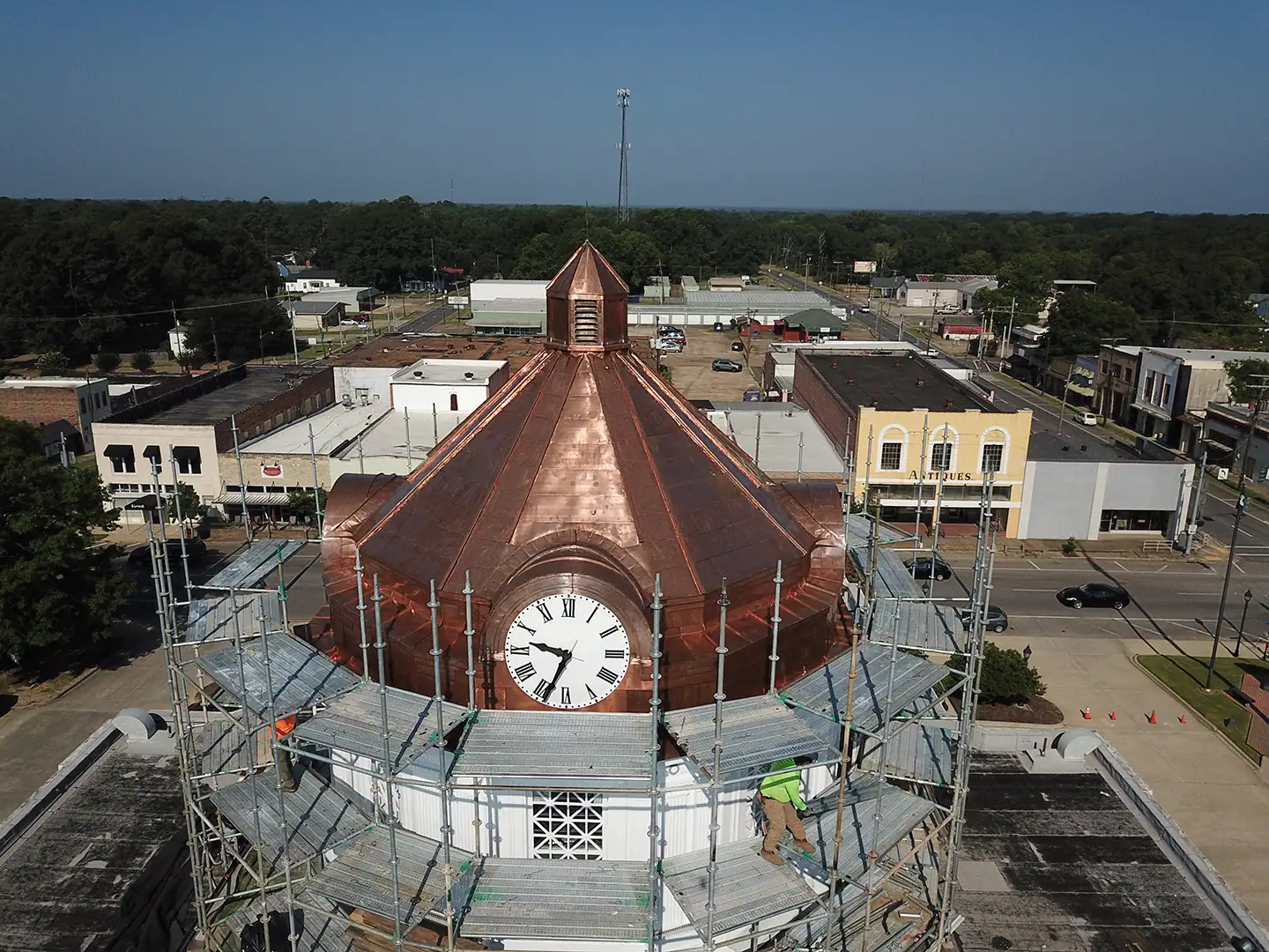 Durable Restoration preserved the 1914 Beaux Arts-style Morehouse Parish Courthouse by expertly removing and replacing its intricate copper roof and iconic four-stage cupola.