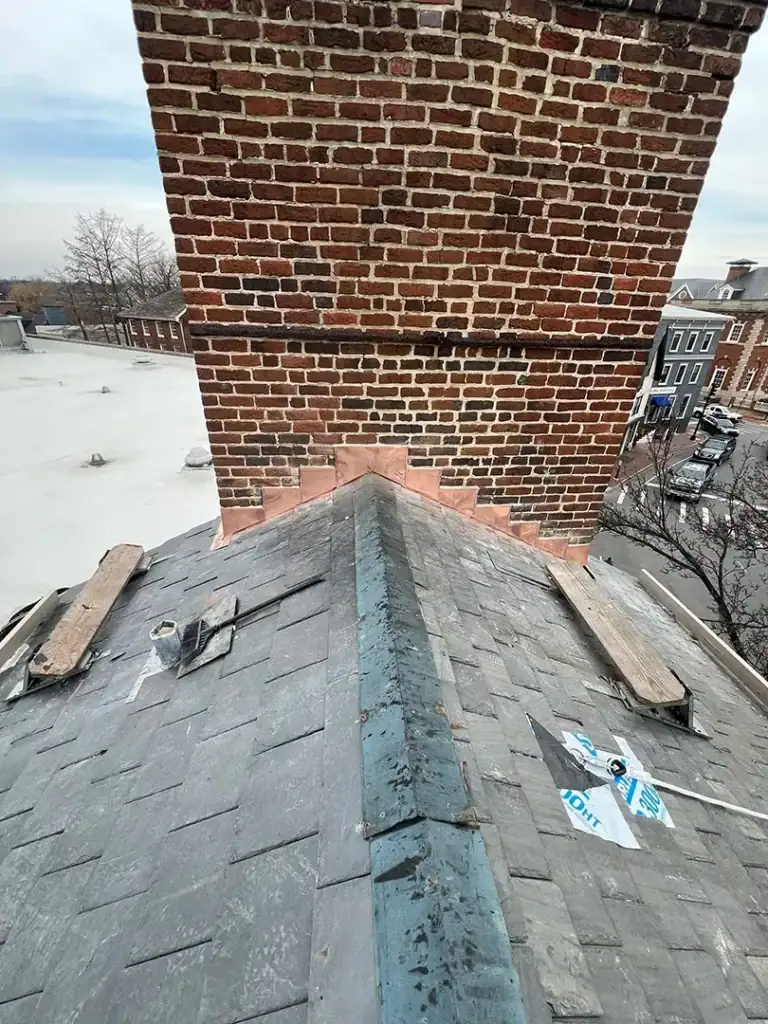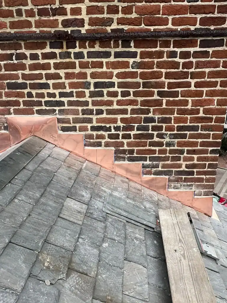 Deteriorated copper flashings, underlayments, and related components will be removed. New 20-ounce copper step, apron, and valley flashings will be installed. All fasteners will be corrosion-resistant copper or stainless steel.